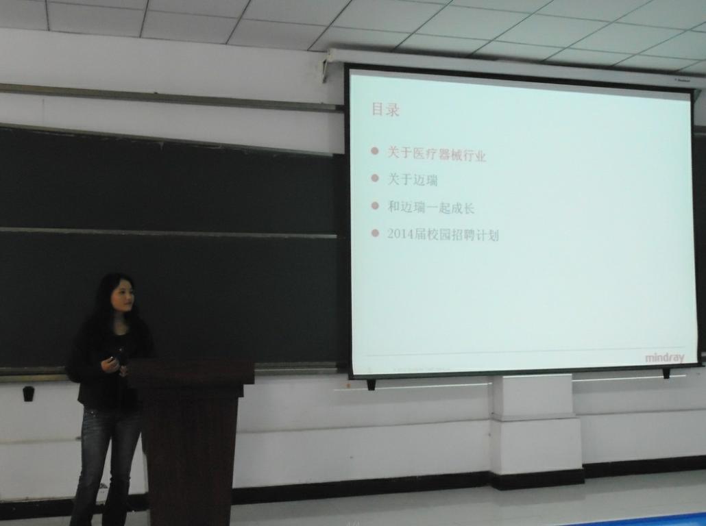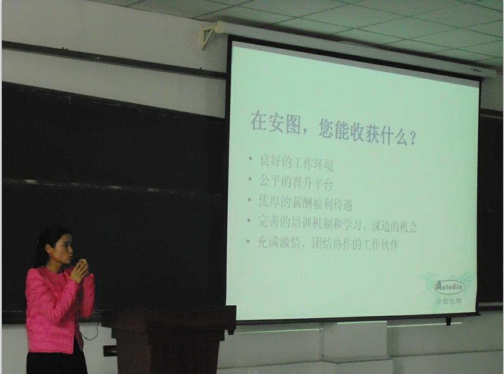 四家公司依次对本公司的现状和实力进行了宣讲。安图生物股份有限公司的主讲人首先放映了公司的宣传片,从公司的实力、管理团队、销售业绩、企业愿景等方面向同学们展现了该公司的发展历程和优势所在, “用心做,更出色”是安图人携手安图,共创美好明天的坚定承诺。上海创实医疗设备有限公司的宣讲人是我校08级的一名毕业生,她以自己的亲身经历详细地为大家介绍了该公司的历史背景、产业研究、招聘过程及招聘方向。随后为大家放映了该公司科学研究的照片,展现公司的发展优势和前景。深圳迈瑞生物医疗电子股份有限公司的主讲人首先放映了三段影片带我们走进了深圳迈瑞。通过对影片的展示和主讲人对公司概况、产业前景、巨大市场及医疗器械行业特点的介绍,同学们了解到迈瑞“成为守护人类健康核心力量”的愿景和“普及高端科技,让更多人分享优质生命关怀”的使命。此外,主讲人还介绍了公司的薪酬福利和员工丰富多彩的业余生活。郑州名泰医疗器械有限公司负责人首先放映了名泰公司的宣传片。主要从实力、人才、爱心、品质等方面进行详细介绍,为大家展现了名泰的发展实力和“以人为本”的求实态度。最后,该公司的市场部经理也亲临现场,向同学们分享他的人生经历和成功之道并进行现场招聘。