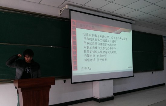 在会议中,刘凯老师首先针对考试违规事项作出详细且全面的说明,并讲解了学校对违纪行为的相关处理与惩罚。紧随其后,刘老师又强调了作弊的严重性,借真实案例警醒大家要认真对待考试、真正做到诚信考试。为了端正同学们的考试态度,加强诚信考试意识,我院学生会组织全体学生进行考前庄严宣誓,铿锵有力、坚定明确的宣誓声是我院同学对自己最庄严的承诺。之后,我院全体学生在诚信考试承诺书上签下自己的名字以示自己的保证。最后,刘凯老师对我院同学送上诚挚的祝福,希望大家能顺利通过考试,并在复习过程中不断扩充知识的深度和广度,提升自己的知识储备。