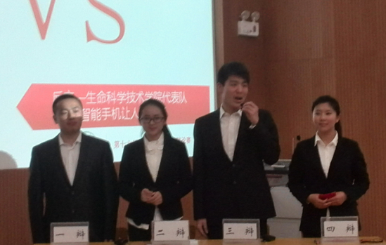 我院和基础医学院分别以“智能手机让人更疏远”和“智能手机让人更亲近”为辩题进行激烈对抗。在双方自我介绍的同时我院四位辩手现场表演的小话剧让大家耳目一新,紧接着比赛正式开始。首先,双方一辩开篇确立论点,分别阐述了自己对智能手机的看法与观点,接着在辩论赛的第二个环节中,双方二辩三辩相互进行的提问,比赛顿时推向高潮,气氛也变的十分紧张、火药味十足。正反两方针对以智能手机对我们的衣、食、住、行各方面的影响为理论依据来反驳对方的观点,语气坚定且时而带些流行色彩,不失幽默感。双方互不相让,打的难分难舍。四辩的总结陈词也赢得了同学们的掌声。
