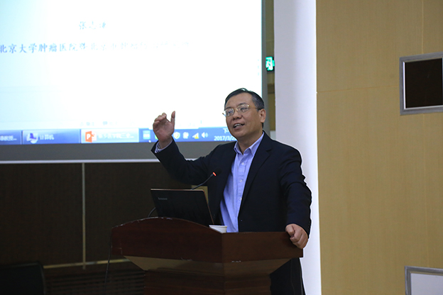 聘任仪式结束后,张志谦教授以《肿瘤干细胞:概念、困惑及希望》为题,从我国恶性肿瘤的发病现状、肿瘤干细胞的概念、特性、效应等方面进行详细讲授,并从自己的研究工作入手,着重介绍了肝癌干细胞的研究进展、难点、肝癌干细胞标志物和治疗方面的最新研究成果。他指出,肿瘤干细胞的存在被认为是肿瘤发生、发展和治疗失败的根本原因,因此发现和鉴定肝细胞癌的肿瘤干细胞、研发针对肿瘤干细胞的治疗手段,有望为肝癌的治疗带来新的曙光。报告会结束,张志谦教授与我院师生进行了现场互动,他对我院同学提问的思路表示赞赏,并逐一认真进行解答,在谈到“当研究中遇到低谷时该怎样面对”时,他认为有没有高额的经费、有没有鲜花都不重要,作为一个研究人员,重要的是要坚定信心,踏实工作。另外他介绍了北京大学临床肿瘤学院公开、公平、公正招收和录取研究生的基本情况,鼓励大家踊跃报考。他还就学生关心的考研方向、科目等问题进行了详细解答。