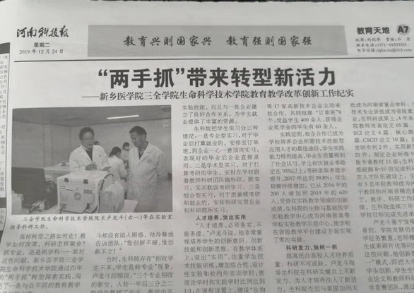 近日,我院院长卢龙斗教授接受了河南科技报记者、采访中心主任吕晓编辑的采访。卢龙斗就yl6809永利的发展思路、教学改革和科学研究方面作了一一介绍,并回答了吕晓感兴趣的问题。随后不久,河南科技报分别以《河南省山楂综合利用工程研究中心--开创山楂“高效提取、精深加工”利用新模式》和《“两手抓”带来转型新活力》为题在综合新闻与教育天地版面刊文,报导了我院的科学研究成果和教学改革新模式。